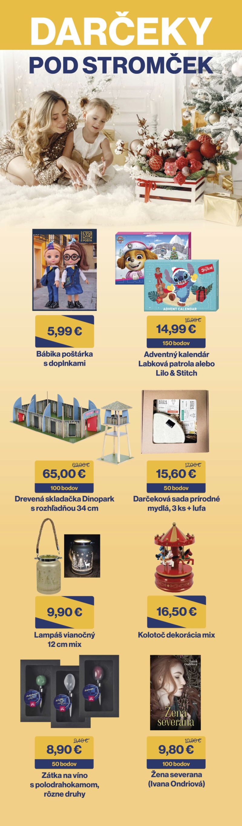 Blížia sa Vianoce a my sme pre vás pripravili výnimočnú sviatočnú ponuku v PostShope, ktorá spríjemní vaše chvíle doma aj obdarí vašich blízkych. Vyberte si z nášho vianočného sortimentu — čaká na vás jedinečná bábika poštárka, adventné kalendáre, obľúbené knihy pre malých aj veľkých, veselé dekorácie do domácnosti či kvalitná kozmetika na zimné rozmaznávanie.