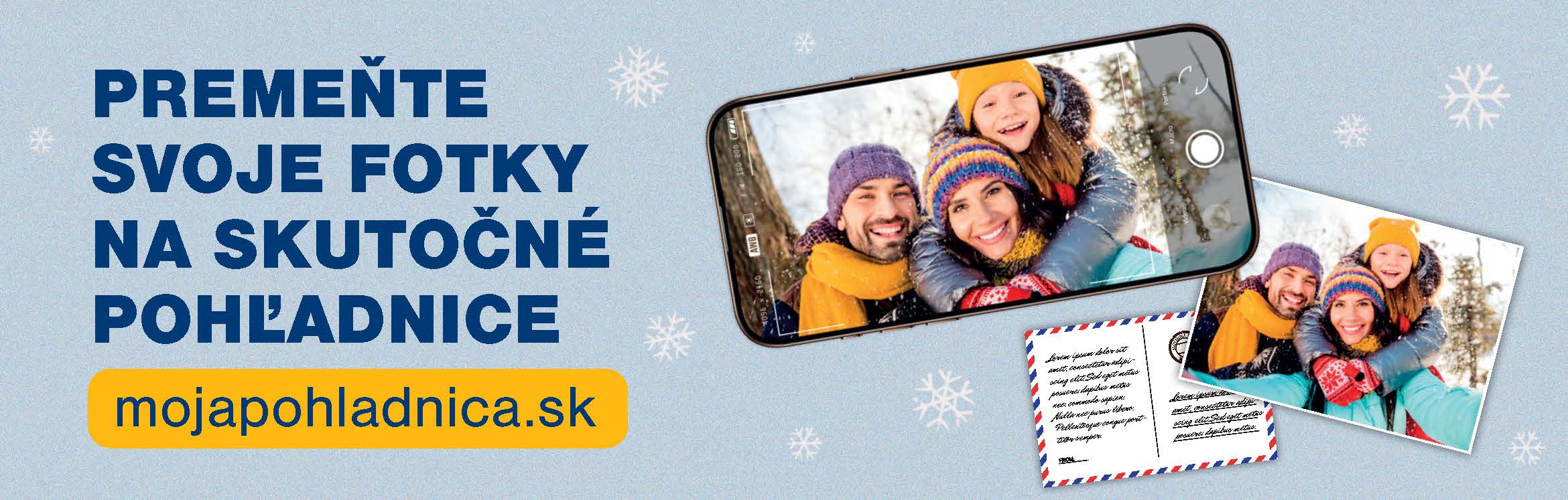 Chcete potešiť blízkych na Vianoce osobným pozdravom? Služba Moja pohľadnica premení vašu digitálnu fotografiu na reálnu pohľadnicu a doručí ju priamo do poštovej schránky – na Slovensku aj v zahraničí. Pohľadnicu odošlete jednoducho online z mobilu alebo z počítača, či už ste doma alebo kdekoľvek vo svete!