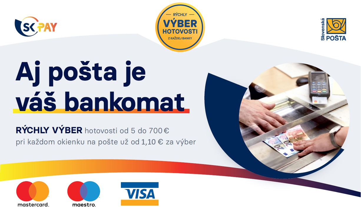 na každej pobočke Slovenskej pošty si môžete rýchlo a jednoducho vybrať hotovosť z ktoréhokoľvek účtu platobnou kartou Mastercard/Maestro alebo VISA. Služba Rýchly výber Vám umožňuje získať hotovosť od 5 EUR do 700 EUR, s výhodným poplatkom už od 1,10 EUR za výber.